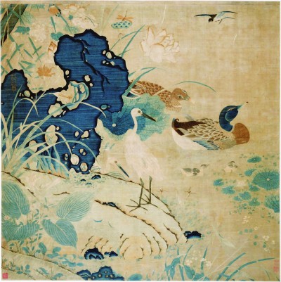 朱克柔 《緙絲蓮塘乳鴨圖》是現(xiàn)存宋代緙絲畫作中的上乘之作,它出自名家之手,流傳有序,且幅式巨大,絲絲縷縷皆勻稱適宜、層次分明。圖中紅葉白鷺,綠萍翠鳥,蜻蜓草蟲,雙鴨游樂,畫面生動活潑,色彩富有變化。青石處有緙織隸書小款“江東朱剛制蓮塘乳鴨圖”,下有“克柔”印一方。(記者 李婷)