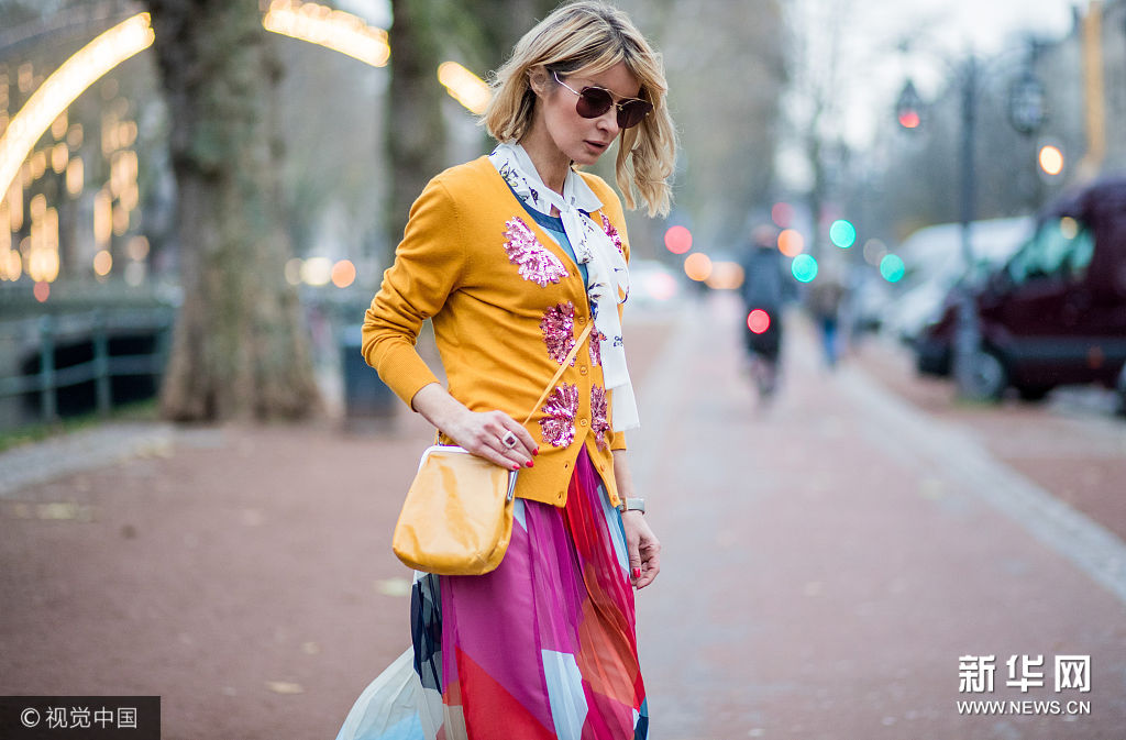 ??? 近日,德國杜塞爾多夫,時尚博主Gitta Banko街拍。她戴Miu Miu茶色墨鏡,身穿Steffen Schraut橘色亮片拼貼針織開衫,內搭Steffen Schraut白色蝴蝶印花系帶雪紡襯衫,Steffen Schraut拼色百褶紗裙,肩背Volker Lang橘色口金包,腳踩Kurt Geiger白色尖頭高跟短靴。