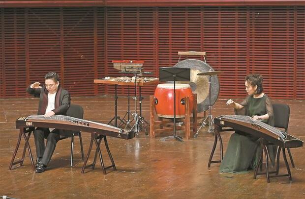 葉小綱創(chuàng)作的古箏獨奏曲《林泉》,可謂清新脫俗,奔涌跌宕,用多種創(chuàng)作手段和高難的演奏技法,將自然界晦明更迭、晴雨接踵、清泉潺潺、惡風獵獵的生動景象加以細致描摹,給古箏的藝術(shù)表現(xiàn)帶來更多的可能性。宋心馨功底好,善表演,表現(xiàn)出人琴合一、情音互融的美好意象。筆者這一代愛樂者大都聽過劉文金的二胡名曲《豫北敘事曲》,此次演奏的是這位民樂大師生前創(chuàng)作的無伴奏二胡二重奏《火·彩衣姑娘》。劉老此曲一改長期延用的傳統(tǒng)路線而風格大變,透露其晚年依然旺盛的創(chuàng)新活力。宋飛師徒身著紫、青兩色連衣裙玉立演奏,“風吹仙袂飄飄舉”,細膩呈現(xiàn)出此曲熱烈、浪漫、溫柔、含蓄的豐富層次,從作品到臺容都給人全新的藝術(shù)感受。
