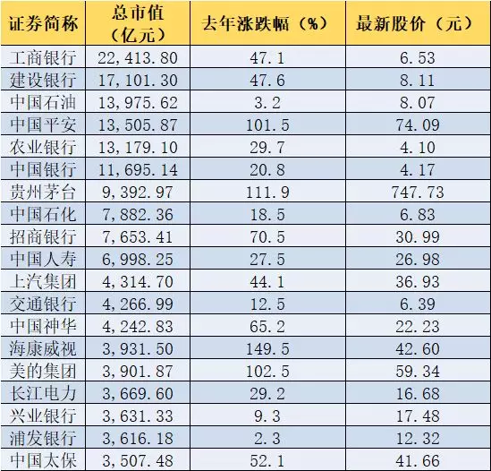 據(jù)匯大數(shù)據(jù)終端統(tǒng)計,截止到今年3月20日,中國平安的市值為1.35萬億,僅次于工商銀行、建設(shè)銀行和中國石油。在市值排名前20名的公司中,去年全年股價漲幅在100%以上的公司僅有4家,分別是海康威視、貴州茅臺、美的集團(tuán)和中國平安,漲幅分別為149.5%,111.9%、102.5%和101.5%。