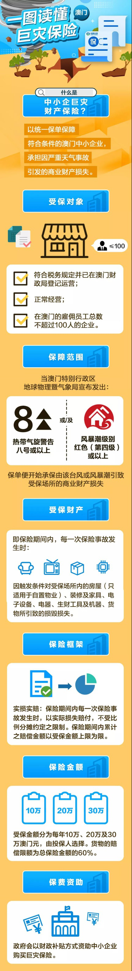 7月31日,今年首個臺風(fēng)“韋帕”來襲,香港、澳門氣象部門相繼懸掛8號風(fēng)球,并發(fā)布黃色風(fēng)暴潮警告。在持續(xù)強(qiáng)降雨和大風(fēng)之際,澳門金融管理局和經(jīng)濟(jì)局舉行聯(lián)合新聞發(fā)布會,宣布推出“中小企巨災(zāi)財產(chǎn)保險”,為中小企業(yè)在8號風(fēng)球/紅色風(fēng)暴潮或以上警告期間,所遭受的商業(yè)財產(chǎn)損失提供保險保障。中國太平旗下太平澳門簽出中小企巨災(zāi)財產(chǎn)保險第一單,為當(dāng)?shù)刂行∑髽I(yè)帶來定心丸。