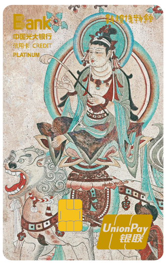 光大敦煌聯(lián)名信用卡卡面設(shè)計(jì)取材于敦煌壁畫,有敦煌大智文殊白金卡、敦煌天宮伎樂白金卡以及敦煌五百?gòu)?qiáng)盜成佛菁英白金卡三種信用卡。光大敦煌聯(lián)名信用卡的卡面設(shè)計(jì)靈感均來(lái)源于敦煌壁畫,大智文殊白金卡畫面為文殊菩薩結(jié)跏坐于青面獅虬首仙獅背上。文殊菩薩是專司智德、辯才第一的大菩薩,尊號(hào)“大智文殊”。天宮伎樂白金卡主體畫面為伎樂天,取材于莫高窟288窟,營(yíng)造了佛陀講經(jīng)說(shuō)法時(shí)佛國(guó)世界歡樂祥和的氛圍。五百?gòu)?qiáng)盜成佛菁英白金卡卡面設(shè)計(jì)取自“五百?gòu)?qiáng)盜成佛”的壁畫故事,佛用神通使被剜去雙眼的強(qiáng)盜重見光明,并對(duì)他們進(jìn)行點(diǎn)化,五百?gòu)?qiáng)盜潛心苦修終成五百羅漢。光大敦煌聯(lián)名信用卡的卡面設(shè)計(jì)將傳統(tǒng)文化融入現(xiàn)代金融產(chǎn)品,極具敦煌文化的風(fēng)格。