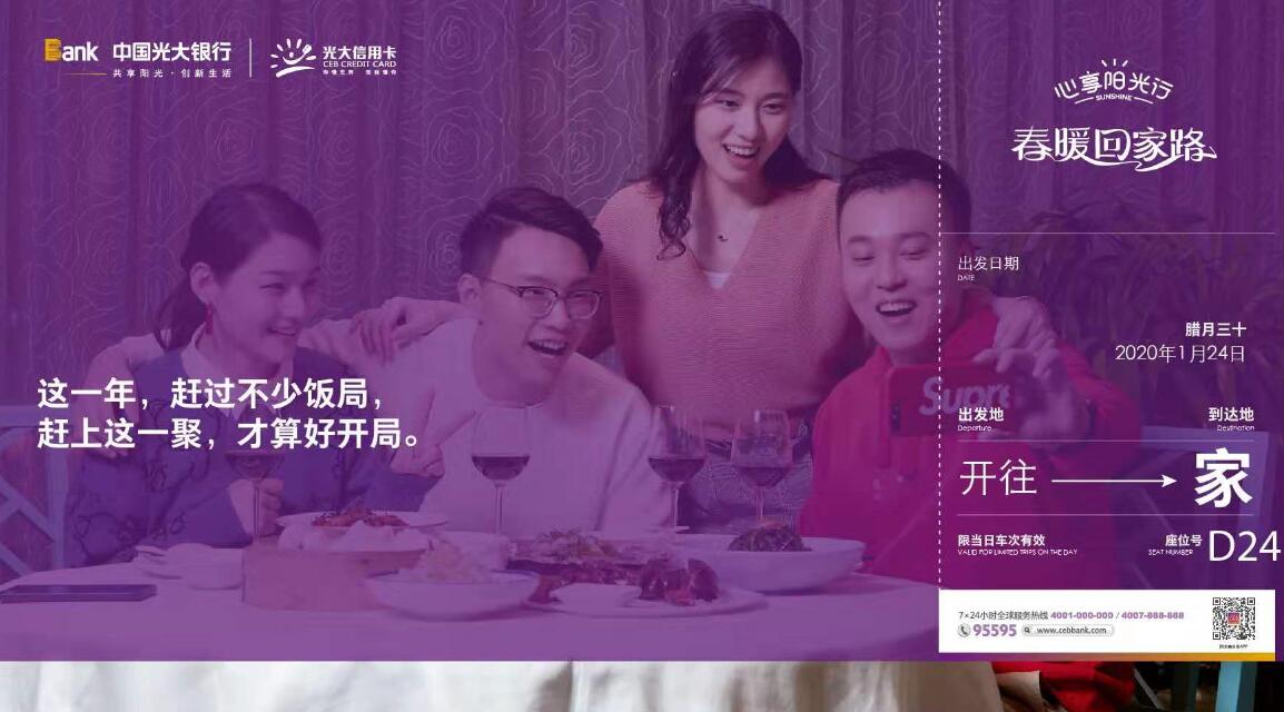 此次“春暖回家路”活動將在全國多地同步開展,圍繞餐飲、出行、娛樂等多種春節(jié)期間關(guān)鍵場景,光大信用卡推出十余個優(yōu)惠活動,包括國內(nèi)機票優(yōu)惠立減、旅游線路優(yōu)惠立減、10元購50元飯票、18元購50元滴滴專車權(quán)益包、口碑優(yōu)惠滿減、口碑APP滿額減等?;顒又攸c從“回家路途”延伸到“回到家后”,涵蓋團圓、走親訪友等各類場景,其中針對年夜飯場景特別推出新春主題榜單、藏寶小鎮(zhèn)兌紅包、餐飲主題快閃店三大核心玩法。此外,2020年是全面建成小康社會的決勝之年,“擁軍愛國送溫暖”等公益行動同步開展,讓“關(guān)愛”“正能量”成為2020年春節(jié)的關(guān)鍵詞。