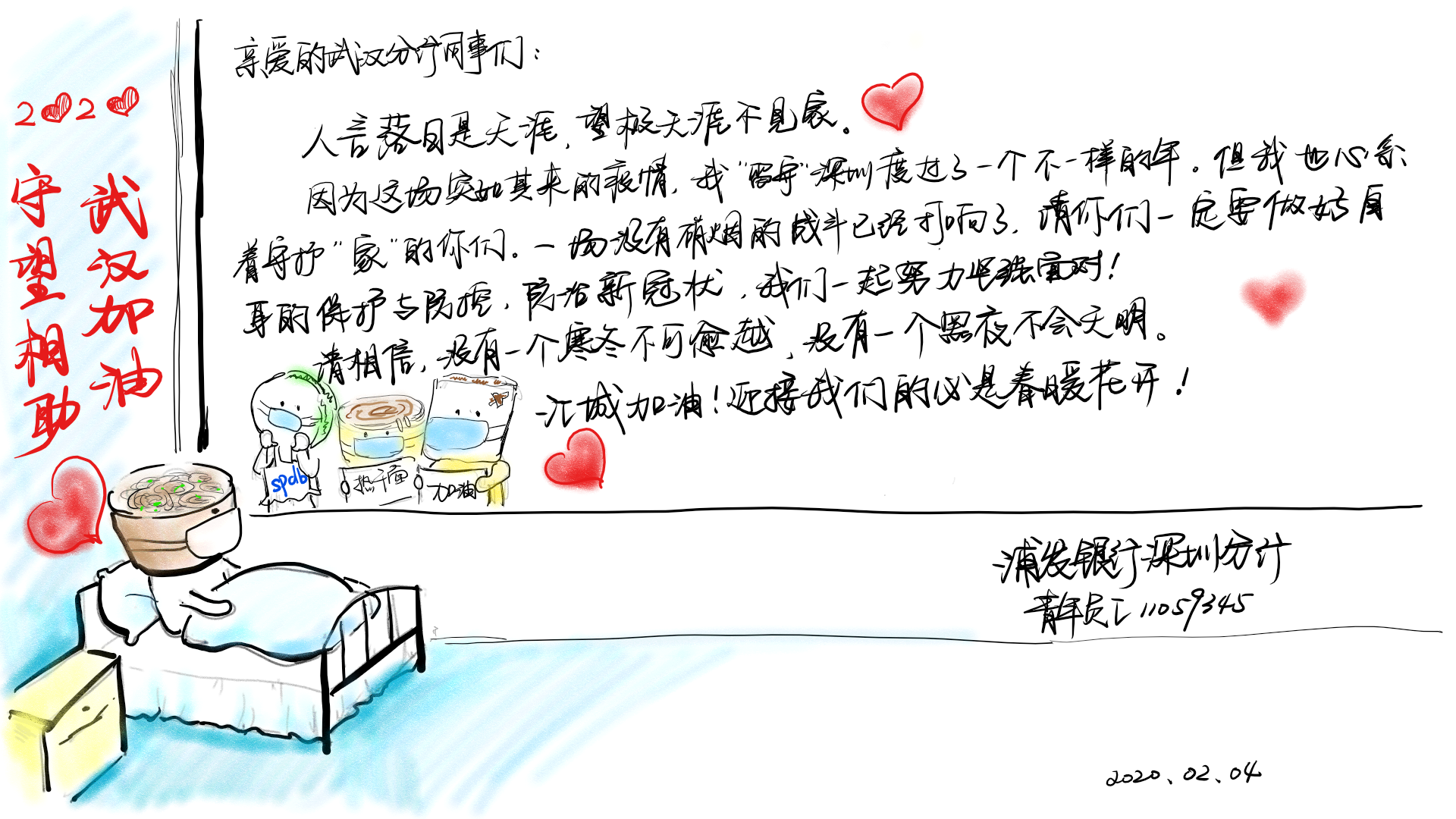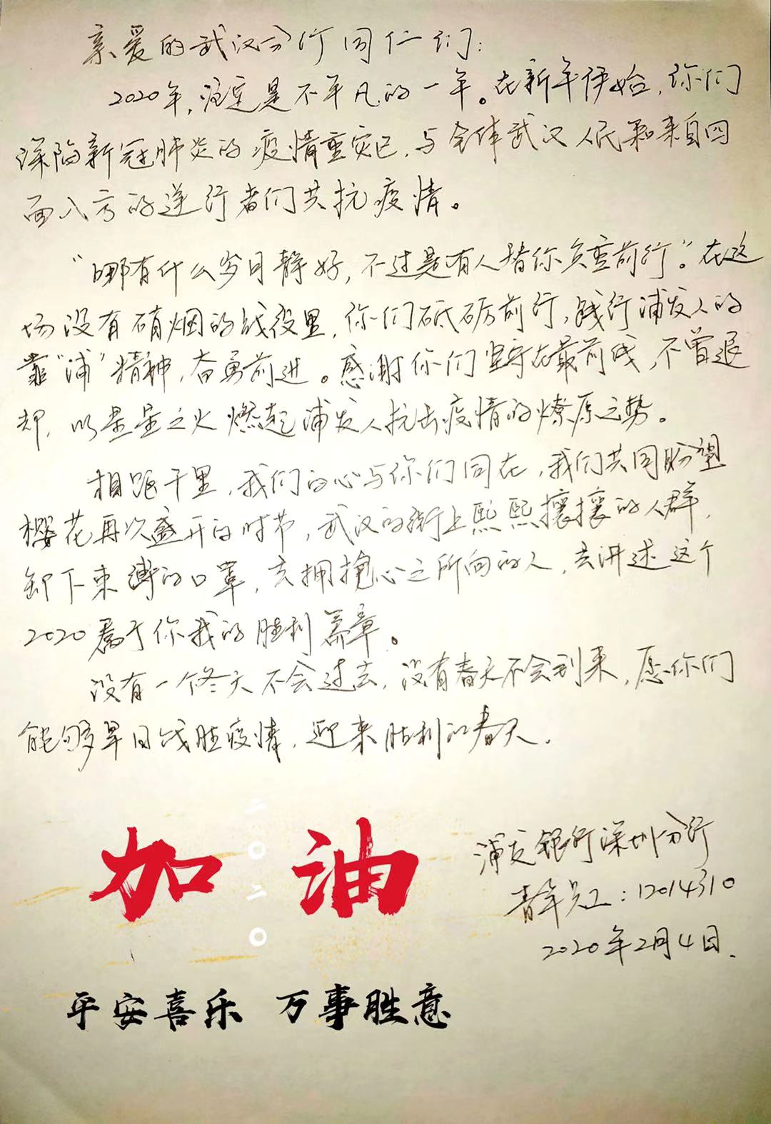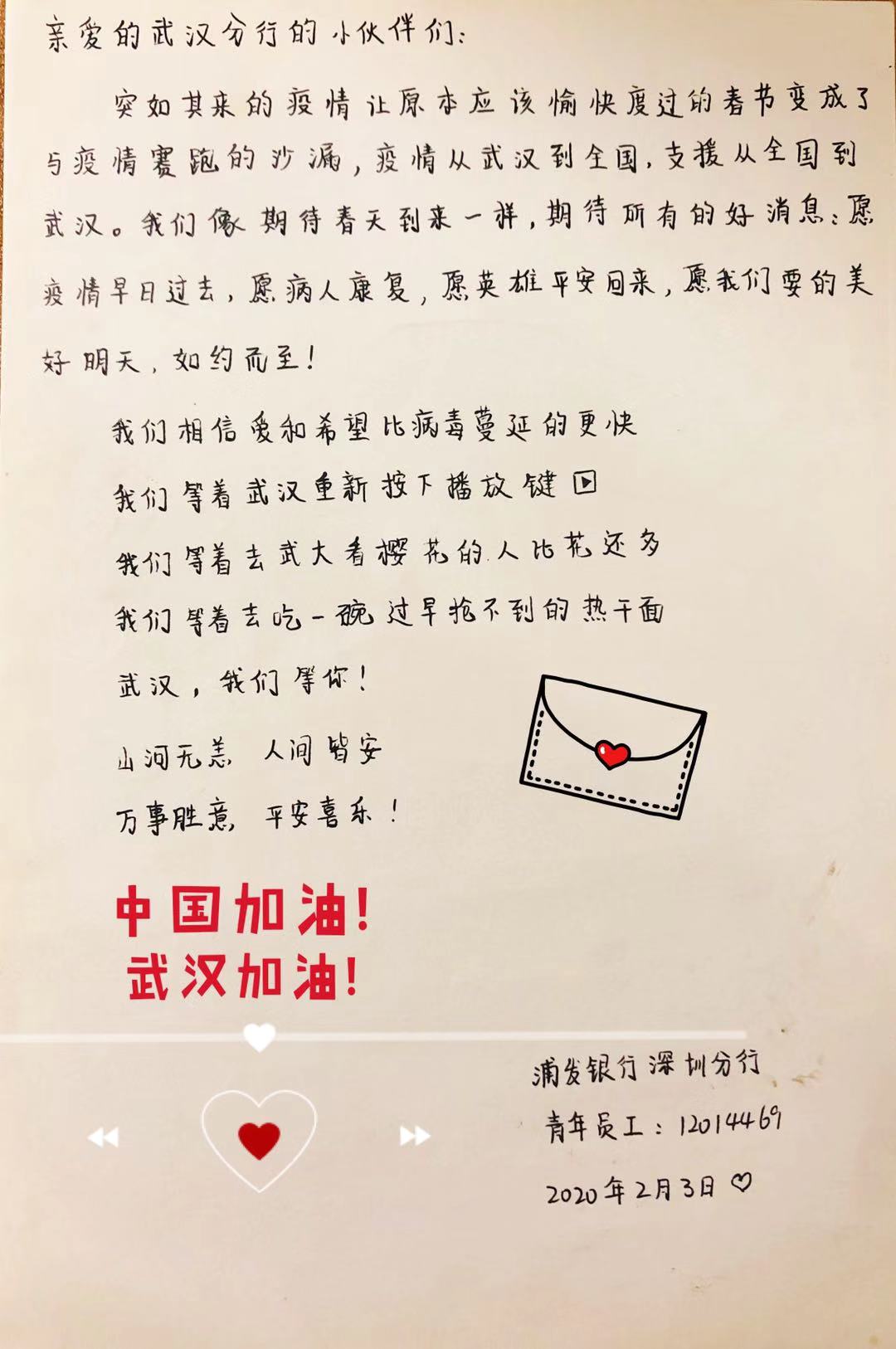 2月3日,浦發(fā)銀行深圳分行團委向全體青年員工發(fā)出了一封倡議書。在倡議書中,該行團委號召廣大團干部、團員青年立即行動,充分發(fā)揮黨的助手和后備軍作用,展現(xiàn)青年突擊隊作為,為堅決打贏疫情防控阻擊戰(zhàn)貢獻力量,并向青年提出三個要求:“堅定信心不迷茫,聽黨指揮勇?lián)敗?、“科學防范不信謠,眾志成城控疫情”、“居家辦公不離崗,服從指揮勇?lián)敗薄.斎?,浦發(fā)銀行深圳分行發(fā)起了給武漢分行同事寄送家書的活動,該行全體青年手寫家書,圖文并茂、紙短情長,表達了對疫區(qū)“戰(zhàn)友們”最深切的關(guān)愛和鼓勵,身體力行做好他們堅強的后盾。