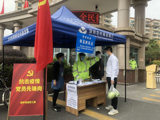 隨著疫情防控形勢的發(fā)展,深圳各街道各社區(qū)都不斷加強疫情防控,在道路口、社區(qū)出入口、樓棟出入口對進出車輛和人員進行篩查。在燕羅街道、松崗街道轄內(nèi)的道路卡口、社區(qū)門口、街道養(yǎng)老院、工廠等防疫檢查站點,記者看到很多印有深圳農(nóng)商行名稱的藍色帳篷。一頂頂帳篷就像一把把‘保護傘’,為防控工作人員提供了遮風擋雨的場所,也守護著轄區(qū)居民的健康。