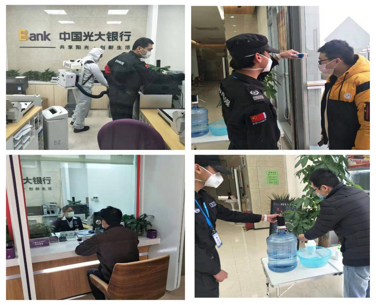 物資保障是防疫工作基礎(chǔ)性工作。復工之前,支行領(lǐng)導帶隊落實復工所需各項物資準備情況,指定專人每天對網(wǎng)點進行清潔與消毒,在所有客戶會觸摸到的公共區(qū)域貼上保鮮膜,每日三次消毒更換。要求全體上崗人員佩戴口罩、手套,做好自身防護。同時,支行根據(jù)自身條件,在門口設(shè)置流動水、洗手液、消毒液、紙巾、口罩回收簍等,在客戶進入網(wǎng)點時,要求必須佩戴口罩、測量體溫、進行洗手登記,切實做好客戶安全防護。