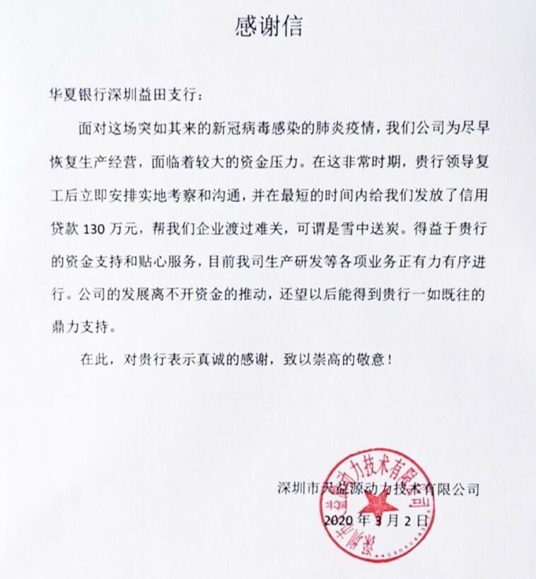 抗疫企業(yè)為華夏銀行深圳益田支行發(fā)來(lái)感謝信
