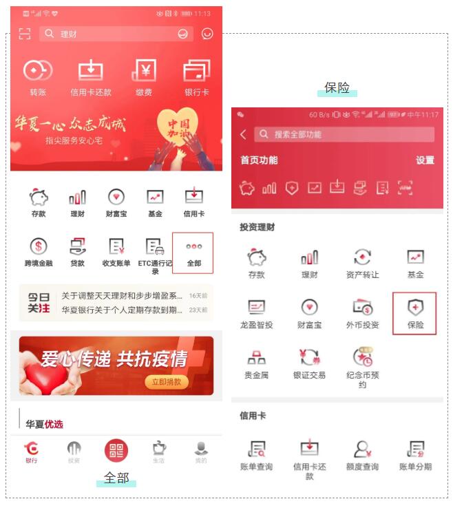 溫馨提示:如果您尚未對您及您的家庭做保險配置,在疫情時期可以通過華夏銀行手機(jī)銀行APP足不出戶配齊保險保障。您只需要打開華夏銀行手機(jī)銀行,在首頁通過“全部”菜單,進(jìn)入“投資理財”板塊,點(diǎn)擊“保險”即可進(jìn)入保險板塊,按照產(chǎn)品類型、場景選擇您需要的產(chǎn)品進(jìn)行購買。
