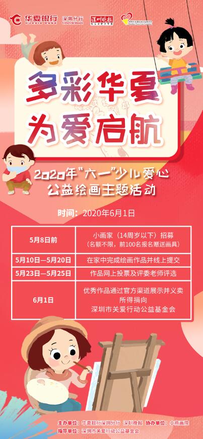 據(jù)了解,該活動(dòng)是由華夏銀行深圳分行攜手深圳晚報(bào)、小燕畫院開展的“多彩華夏為愛啟航”少兒愛心公益繪畫。活動(dòng)向深圳市民招募小畫家,邀請(qǐng)他們用手中畫筆描繪精彩世界。同時(shí),將繪畫賦予公益與愛心,評(píng)選出部分優(yōu)秀作品進(jìn)行線上義賣,以點(diǎn)亮地貧兒童的生命之光。