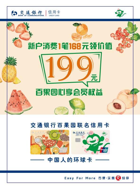 這款卡片不僅卡面超可愛,有五彩繽紛的水果圖案,也有百果園的猴果果logo,元氣滿滿;福利也很硬核,現(xiàn)在辦理交通銀行百果園聯(lián)名信用卡,新戶達標就可以免費領價值199元百果心享會員年卡,擁有它就擁有百果園的上千元權益!