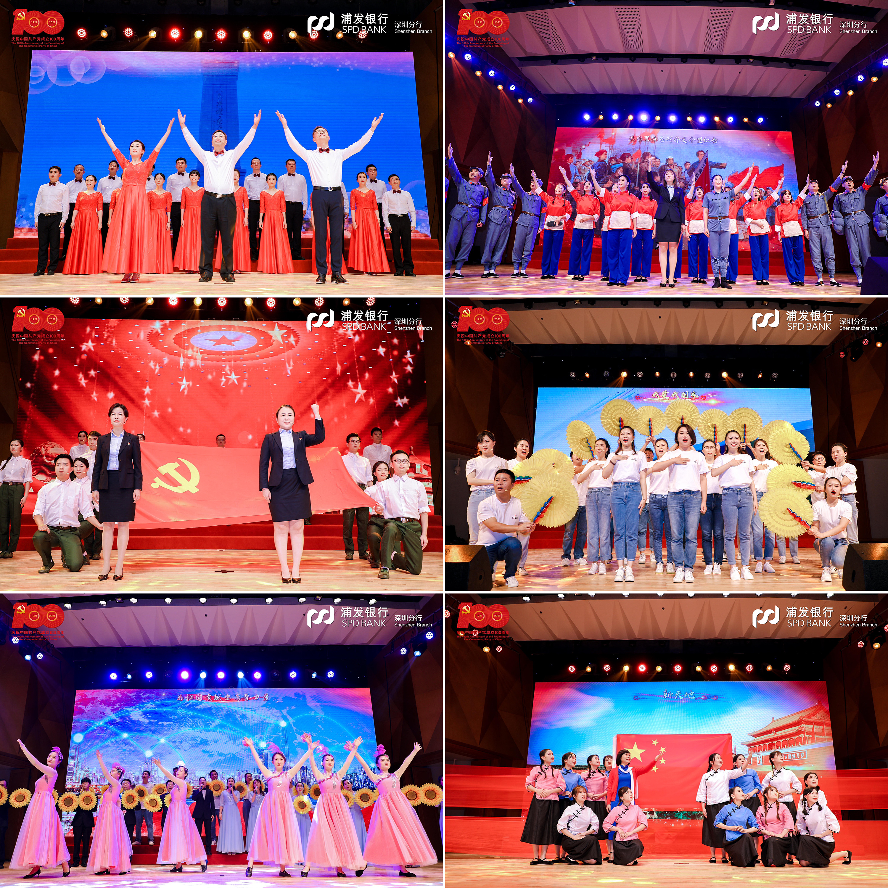 在黨支部風(fēng)采展示環(huán)節(jié),該行基層黨支部精心編排12首紅色經(jīng)典,通過4個(gè)篇章再現(xiàn)百年波瀾壯闊的偉大歷程。第一篇章“開天辟地”演繹了中國共產(chǎn)黨在新民民主義革命時(shí)期完成救國大業(yè)的輝煌歷程,《保衛(wèi)黃河》吹響了高亢嘹亮的愛國號(hào)角,《十送紅軍》深情演繹血濃于水軍民情,《繡紅旗》一腔熱血帶著大家重回歌樂山。第二篇章“改天換地”回顧了中國共產(chǎn)黨在社會(huì)主義革命和建設(shè)時(shí)期完成興國大業(yè)的奮斗史詩,《歌唱祖國》撥動(dòng)人們最難忘的記憶,《我們走在大路上》展現(xiàn)當(dāng)年敢闖敢拼的奮進(jìn)之姿態(tài),《唱支山歌給黨聽》唱出人民心中永恒的贊歌。第三篇章“翻天覆地”再現(xiàn)了中國共產(chǎn)黨在改革開放和社會(huì)主義現(xiàn)代化建設(shè)新時(shí)期推進(jìn)富國大業(yè)的光榮壯舉,《在燦爛陽光下》重現(xiàn)春風(fēng)化雨之后的奮斗時(shí)光,《國家》打動(dòng)多少人的赤子之心,《我們的生活充滿陽光》訴說了改革開放背后的喜悅。第四篇章“驚天動(dòng)地”展現(xiàn)了中國共產(chǎn)黨在中國特色社會(huì)主義新時(shí)代推進(jìn)并將在本世紀(jì)中葉實(shí)現(xiàn)強(qiáng)國大業(yè)的偉大時(shí)代,一首《天耀中華》是浦發(fā)人最深沉的表達(dá),《燈火里的中國》讓人漫步燈火漫卷的萬里山河,《再一次出發(fā)》展示浦發(fā)追夢者的雄姿英發(fā)。走過“百年風(fēng)雨”,浦發(fā)銀行深圳分行合唱團(tuán)一首《我和我的祖國》,蓬勃朝氣盡顯拳拳愛國心、濃濃赤子情。篇章結(jié)束,大家全體起立,高聲合唱《沒有共產(chǎn)黨就沒有新中國》,以最真摯最熱烈的歌聲獻(xiàn)禮建黨百年。