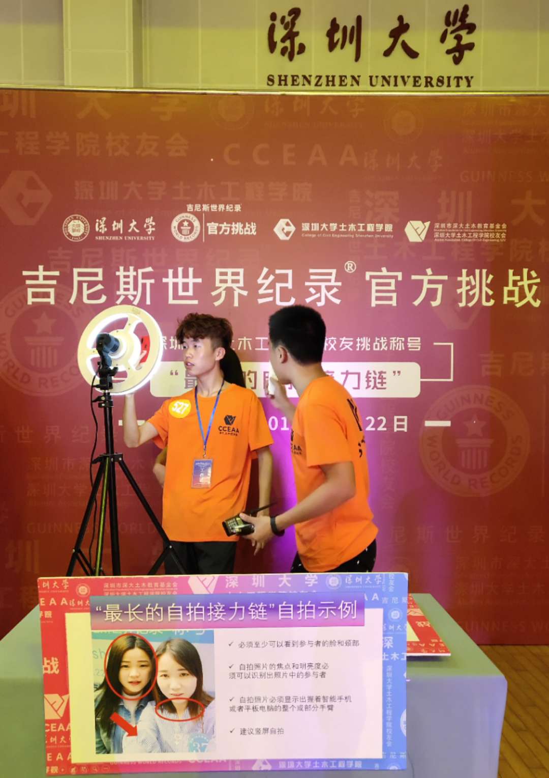 深圳新聞網(wǎng)訊 9月22日下午3點(diǎn),深圳大學(xué)土木工程學(xué)院千名師生、校友齊聚深圳大學(xué)元平體育館,成功創(chuàng)造“最長的自拍鏈條”吉尼斯世界紀(jì)錄 TM 稱號。