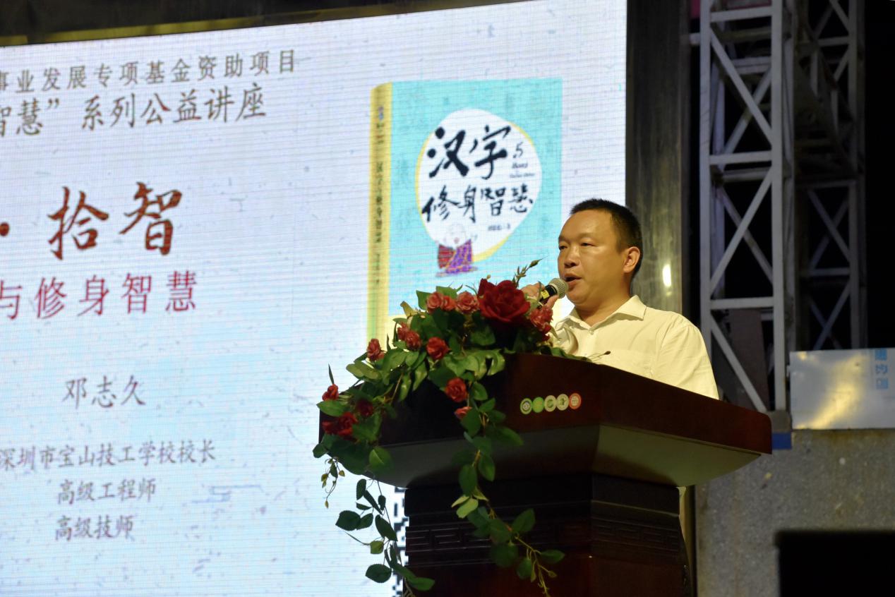 9月18日晚上7時(shí),由深圳市閱讀聯(lián)合會(huì)、深圳市壹書(shū)文化傳播有限責(zé)任公司和寶山讀書(shū)會(huì)共同主辦的“‘識(shí)字拾智’——對(duì)話漢字與修身智慧”公益文化講座在寶山技工學(xué)校寶山大舞臺(tái)拉開(kāi)了序幕。