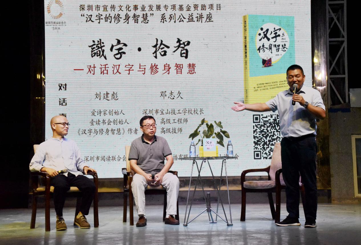 深圳新聞網(wǎng)訊 9月18日晚上7時(shí),由深圳市閱讀聯(lián)合會(huì)、深圳市壹書(shū)文化傳播有限責(zé)任公司和寶山讀書(shū)會(huì)共同主辦的“‘識(shí)字拾智’——對(duì)話漢字與修身智慧”公益文化講座在寶山技工學(xué)校寶山大舞臺(tái)拉開(kāi)了序幕。據(jù)悉,這是由深圳市宣傳文化事業(yè)發(fā)展專項(xiàng)基金資助項(xiàng)目“漢字的修身智慧”的第三場(chǎng)公益文化講座,以劉建彪《漢字與修身智慧》新書(shū)分享為契機(jī),傳播漢字正能量,讓更多的青少年識(shí)字長(zhǎng)智,領(lǐng)略漢字文化之精妙。