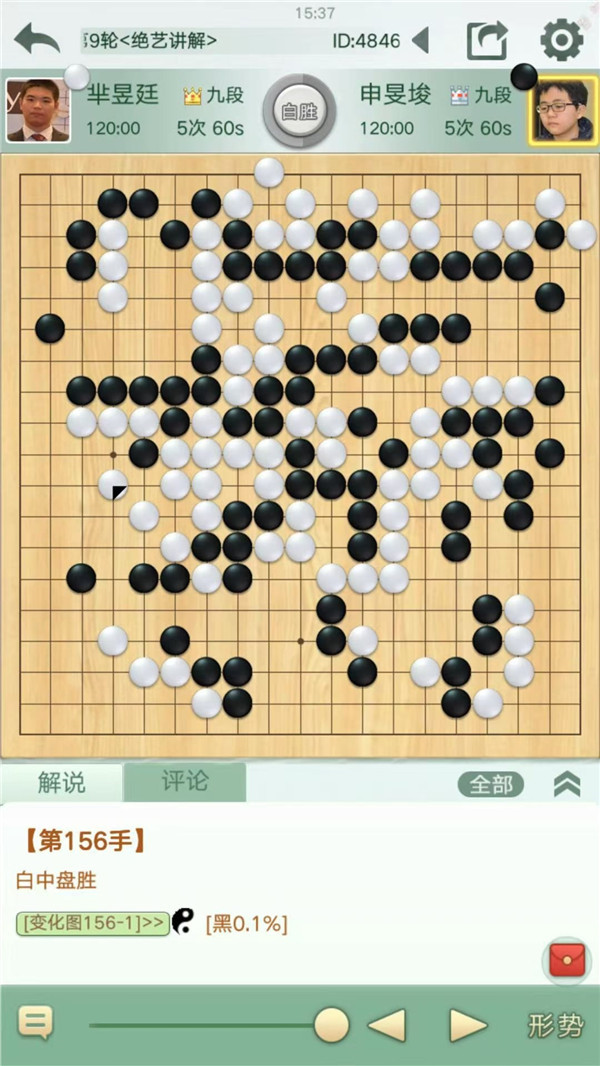 主將臺(tái)由深圳宏發(fā)隊(duì)的外援、目前韓國(guó)等級(jí)分第三的申旻埈九段執(zhí)黑對(duì)陣江蘇隊(duì)的世界冠軍羋昱廷九段。在序盤(pán)階段的接觸戰(zhàn)中,黑棋原本簡(jiǎn)明處理即可取得優(yōu)勢(shì),但申旻埈選擇了挑起戰(zhàn)斗,并在戰(zhàn)斗中未能處理好棋形,被擅長(zhǎng)作戰(zhàn)的羋昱廷抓住機(jī)會(huì)一舉反擊,取得勝勢(shì)。
