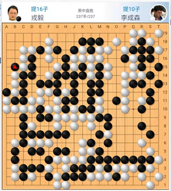 快棋臺由深圳隊的戎毅七段執(zhí)黑對陣天津隊的李成森五段。序盤平穩(wěn)過渡,進(jìn)入中盤時黑棋在白上方大空中試應(yīng)手,白棋最大程度強撐大空,留下隱患。在下方定型結(jié)束后,黑棋在白空中弈出巧手將白空打穿,取得領(lǐng)先。在劣勢情況下,白棋在爭搶官子時置中央大龍于不顧,黑棋攻殺白大龍順勢將白棋左下角吃掉,一舉獲勝。戎毅執(zhí)黑中盤勝李成森。
