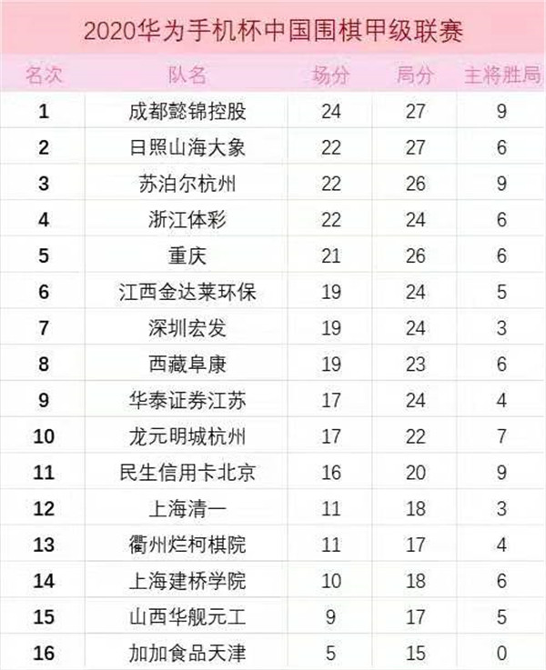 本輪深圳宏發(fā)隊3:1勝加加食品天津隊全取三分,目前積19分,暫列第七。本輪其它隊賽果如下:龍元明城杭州隊 2:2 重慶隊,上海建橋?qū)W院隊 1:3 成都懿錦控股隊,華泰證券江蘇隊 3:1 江西金達(dá)萊環(huán)保隊,日照山海大象隊 3:1 衢州爛柯棋院隊,西藏阜康 3:1 上海清一,浙江體彩隊 3:1 民生信用卡北京隊,蘇泊爾杭州隊 2:2 山西華艦元工隊。