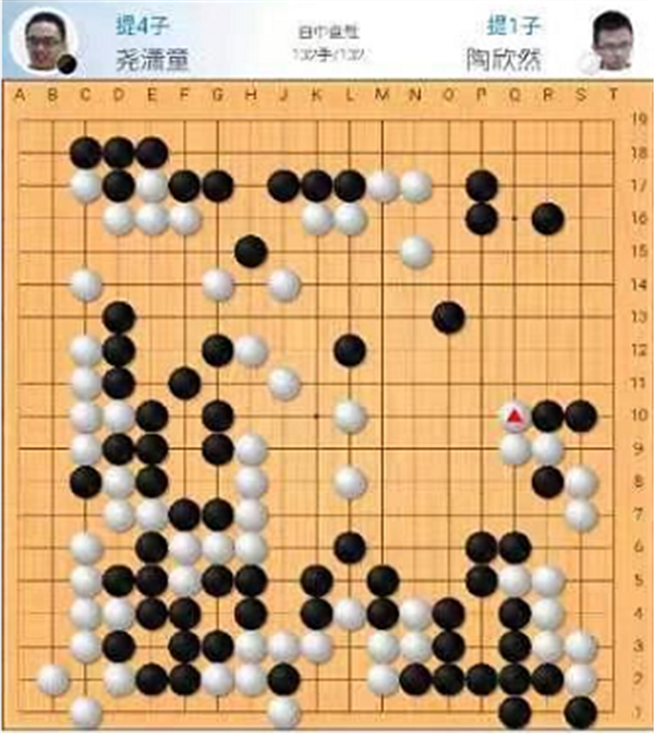 慢棋第四臺由深圳隊的陶欣然八段執(zhí)白對陣天津隊的堯瀟童二段。雙方開局形成少見的新變化,白棋取得優(yōu)勢。之后白棋牢牢掌控局面,至132手兵不血刃快勝,陶欣然執(zhí)白中盤勝堯瀟童。
