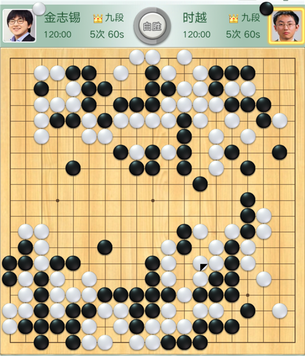 緊接著,時(shí)越執(zhí)黑對陣金志錫一局傳來告負(fù)的消息??v觀全局,開局時(shí)黑稍好,但中盤攻擊上邊白棋時(shí)候方向錯(cuò)誤,被白棋聯(lián)絡(luò)后自身還留下了白棋開劫的隱患。之后黑棋在劫爭中放棄上方黑子在下邊圍出大模樣爭勝。白棋在黑勢中施展手段時(shí)黑棋必需尋求凈殺白子。無奈周邊不夠厚實(shí)殺不掉,遂于174手時(shí)認(rèn)負(fù)。