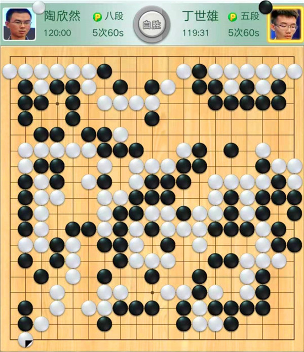 最后一局隨即揭曉:陶欣然“錦上添花”,執(zhí)白完勝丁世雄。布局時(shí),白棋左邊與右上獲利。黑棋進(jìn)攻右邊白棋時(shí)候,白棋漂亮棄子搶占左下大棋優(yōu)勢擴(kuò)大。之后白棋穩(wěn)扎穩(wěn)打直至終局獲勝。