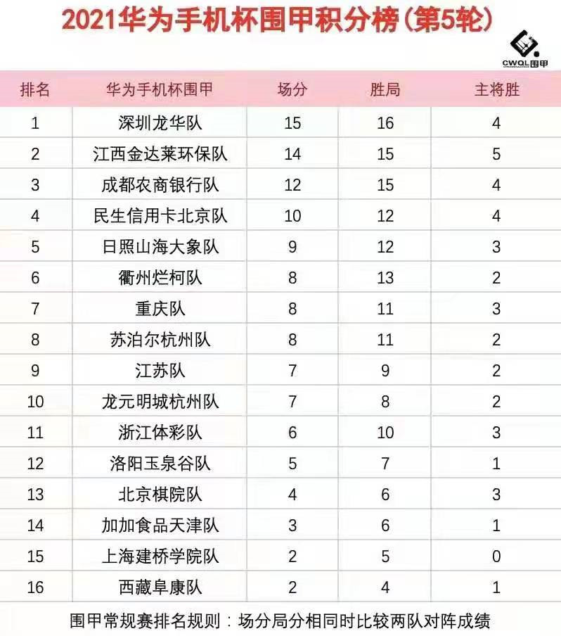 第五輪各隊戰(zhàn)況如下:衢州爛柯4比0勝加加食品天津;浙江體彩隊1:3深圳龍華隊;日照山海大象隊1:3江西金達萊環(huán)保隊;重慶隊3比1民生信用卡北京隊;成都農商銀行隊3:1勝江蘇隊;西藏阜康2:2主將勝上海建橋學院;北京棋院隊2:2主將勝洛陽玉泉谷隊;蘇泊爾杭州2:2主將負龍元明城杭州。第一階段結束,深圳龍華隊五戰(zhàn)全勝積15分居“魁首”,江西金達萊環(huán)保隊僅以一分之差緊隨其后,成都農商銀行隊積12分居第三位。