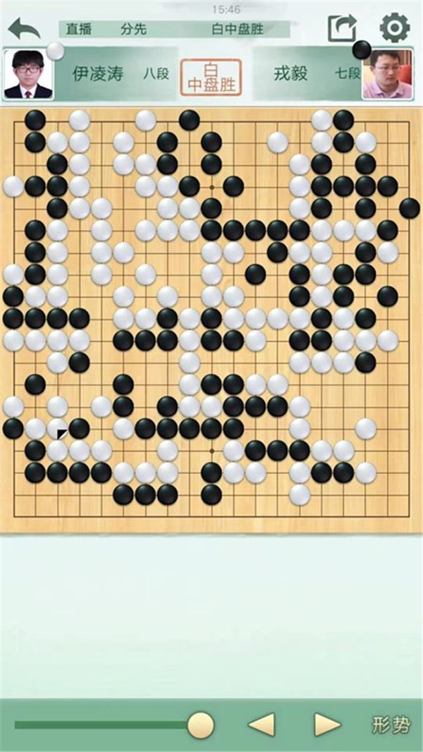 二臺陶欣然執(zhí)白主將對陣世界冠軍江維杰。開局白有利,左邊白棋進攻黑棋時候手法過于松緩,局面接近。之后白棋中央又出現(xiàn)緩手黑棋領先。之后右上白棋主動開劫,但是劫材處理失誤,局面惡化。之后黑棋稍有退讓保持小勝。