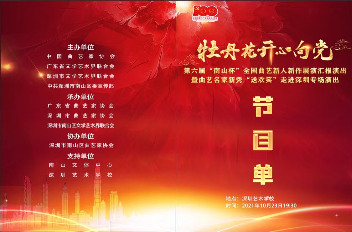 據(jù)悉,本次活動(dòng)由中國(guó)曲藝家協(xié)會(huì)、廣東省文學(xué)藝術(shù)界聯(lián)合會(huì)、深圳市文學(xué)藝術(shù)界聯(lián)合會(huì)、中共深圳市南山區(qū)委宣傳部共同主辦。廣東省曲藝家協(xié)會(huì)、深圳市曲藝家協(xié)會(huì)、南山區(qū)文學(xué)藝術(shù)界聯(lián)合會(huì)共同承辦。