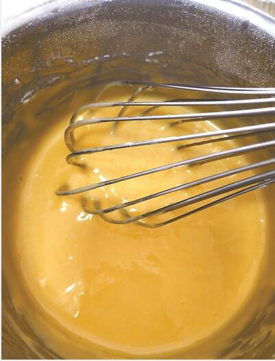 將蛋黃加入拌好的面糊里,拌均勻成蛋黃糊。