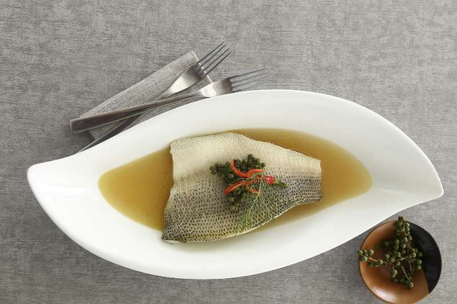 區(qū)別于充斥著辣椒與熱油的傳統(tǒng)水煮魚,梧桐 PLUS 的 fusion水煮魚外表清新,口感麻辣。食材選用三斤左右的上等淡水鱸魚,清晨宰殺,剔骨后整場取肉,再經(jīng)過高溫蒸制,保證魚肉肉質(zhì)嫩滑松軟。并不像傳統(tǒng)的水煮魚采用的“湯菜”的方式,fusion水煮魚采用肉料分離的烹飪方式。魚湯經(jīng)過麻椒、辣椒的熬煮而變得味道濃郁,過濾后僅留清爽的湯汁,單從視覺上根本無法判斷蘊(yùn)藏的奇妙味道,這也正是這道招牌菜的精妙之處。盛盤后的fusion 水煮魚猶如一道藝術(shù)品,造型簡約充滿意境,清亮的魚湯入口瞬間酸辣感通透口腔,脫離了紅油浸泡的濃郁麻辣口感,更加健康養(yǎng)生。