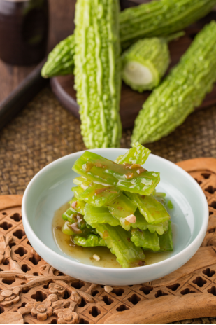 苦瓜又叫涼瓜,滌熱,明目,清心。通過(guò)冰鎮(zhèn)使苦瓜呈青翠瑩亮的半透明狀,青梅腌制的醬,降低了苦瓜的苦度,調(diào)和出酸甜適口、清涼甘苦的滋味。