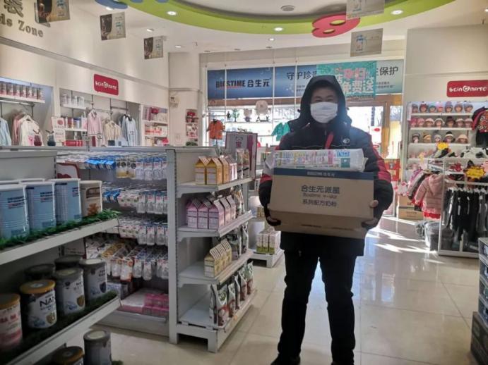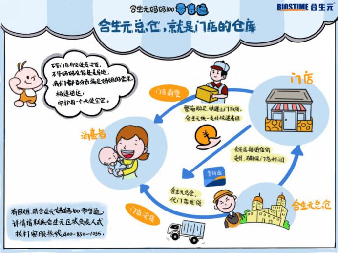 顧客因道路封閉等原因在老家,需要奶粉,和原來常住地的母嬰門店老板下單。如果原來母嬰門店無法寄送產品到異地的消費者,母嬰門店老板把需求報給合生元媽媽100零售通,合生元從自己的總倉出貨快遞,利潤還計入原來門店的賬上。