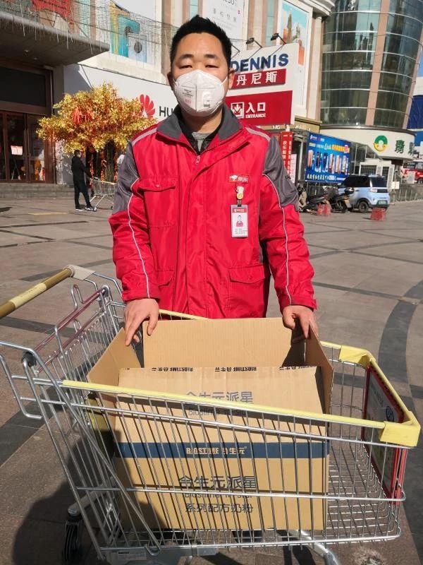 2月14日,京東快遞員在配送合生元產品的路上。