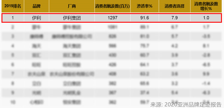 見圳客戶端·深圳新聞網(wǎng)2020年6月23日訊 日前,凱度消費者指數(shù)發(fā)布了《2020亞洲品牌足跡報告》。伊利憑借91.6%的品牌滲透率、近13億的消費者觸及數(shù)和近8次的購買頻次,連續(xù)五年位列中國市場消費者選擇最多的品牌榜首。綜合報告數(shù)據(jù)顯示,伊利各項指標在榜單中領(lǐng)先于其他品牌,持續(xù)領(lǐng)跑中國快消品市場。