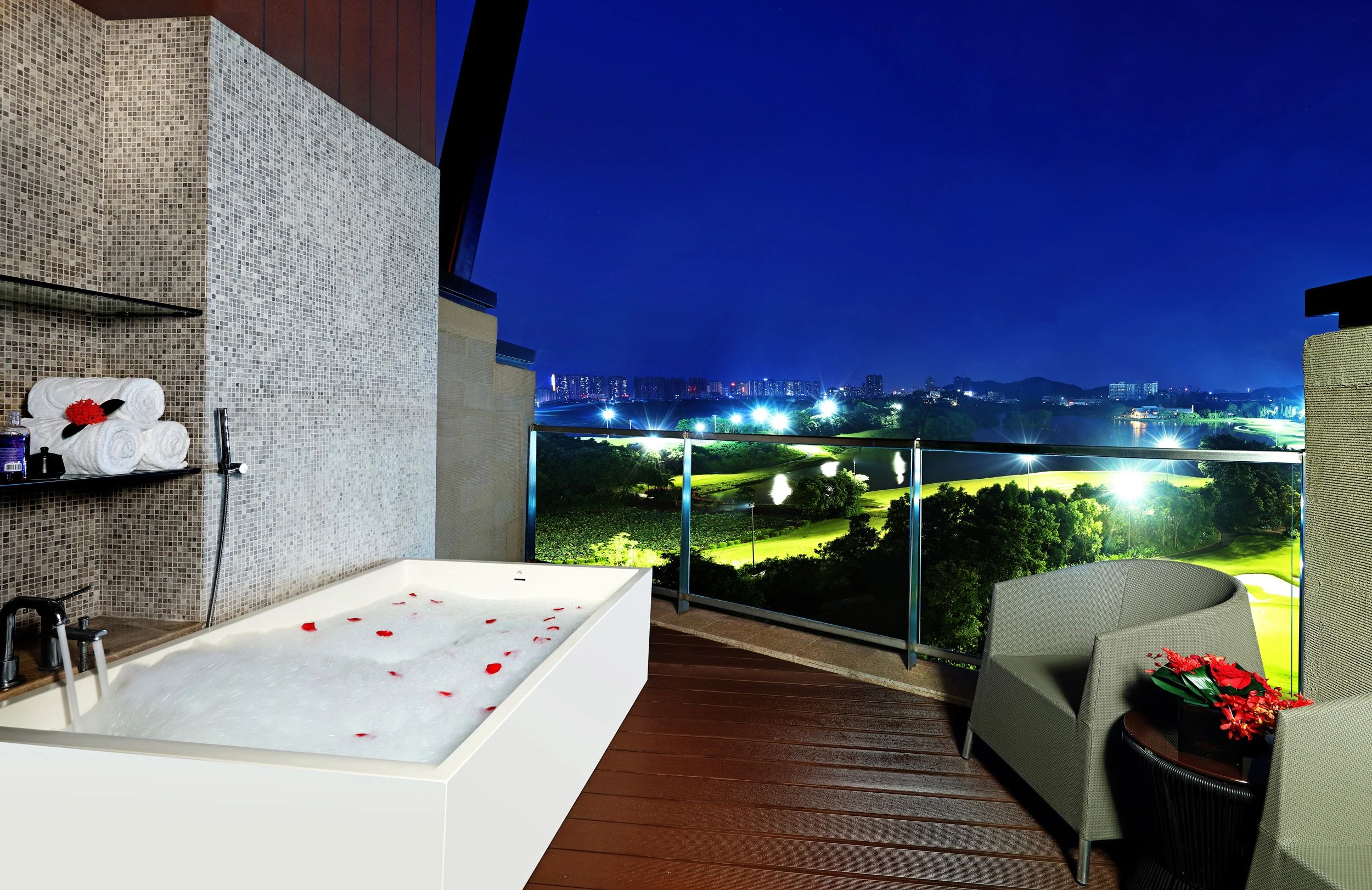 酒店大手筆地設(shè)置了單側(cè)客房,只為220間房都能直面250萬㎡高爾夫果嶺景觀。而且大部分都配備了陽臺浴缸,可以對著山水泡澡,私密性也極好。