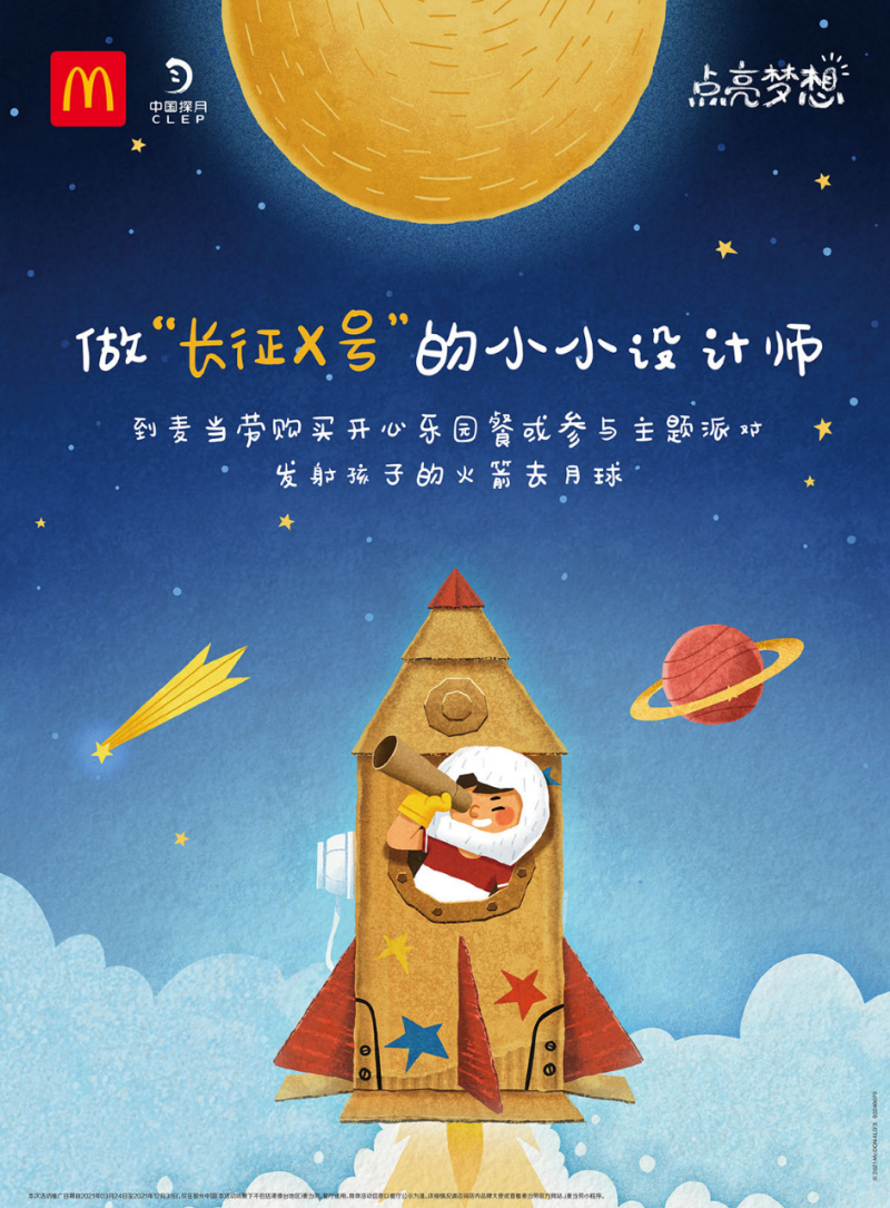 2021點(diǎn)亮夢(mèng)想活動(dòng),是麥當(dāng)勞與中國探月的二度合作,雙方再次聯(lián)合守護(hù)夢(mèng)想,并鼓勵(lì)動(dòng)手實(shí)踐,做到“敢夢(mèng)敢想敢為”。