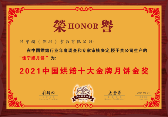經過多年的發(fā)展與沉淀,佳寧娜月餅以先進的工藝、獨特的口味、卓越的信譽贏得消費者的信賴和支持,曾榮獲“深圳老字號”“深圳月餅節(jié)質量信譽獎” (連續(xù)12年 )“中國食品安全年會食品安全示范單位”“中國烘焙五仁月餅金獎”“中國烘焙廣式月餅金獎”“中國烘焙潮式月餅金獎”、“中國烘焙十佳名牌月餅”、“中國烘焙老字號月餅“等多項榮譽稱號。