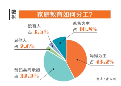 此次調(diào)查中,用14個(gè)指標(biāo)考察家庭教育分工情況,包括:輔導(dǎo)孩子學(xué)習(xí)、培養(yǎng)孩子特長(zhǎng)、接送孩子上下學(xué)、開家長(zhǎng)會(huì)、培養(yǎng)孩子日常行為習(xí)慣、糾正孩子的不良行為、教孩子明辨是非、照顧孩子的飲食起居、和孩子一起游戲及和孩子聊天。統(tǒng)計(jì)數(shù)據(jù)顯示,家庭教育分工中,“媽媽為主”的家庭占43.2%,“爸爸為主”占10.8%,“爸媽共同承擔(dān)”占39.9%,“其他人做”占2.6%,“沒(méi)有人做”占3.5%。