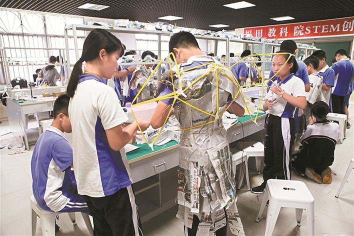 當(dāng)日,學(xué)生與機器人同臺主持開幕式,在科技中學(xué)首次實現(xiàn)了現(xiàn)場語音識別,讓大家近距離感受了一把AI在現(xiàn)實生活中的應(yīng)用?!案?票鼻嗌倌陝?chuàng)客大挑戰(zhàn)有來自福田區(qū)各校60多支隊伍參與,比賽要求參賽隊伍在使用吸管、透明膠、報紙、剪刀、可控?zé)魩А⒋┛谉舻群唵蔚牟牧虾凸ぞ?,且?shù)量使用有限制的情況下,設(shè)計一件“未來”校服,制作限定時間1小時30分鐘。