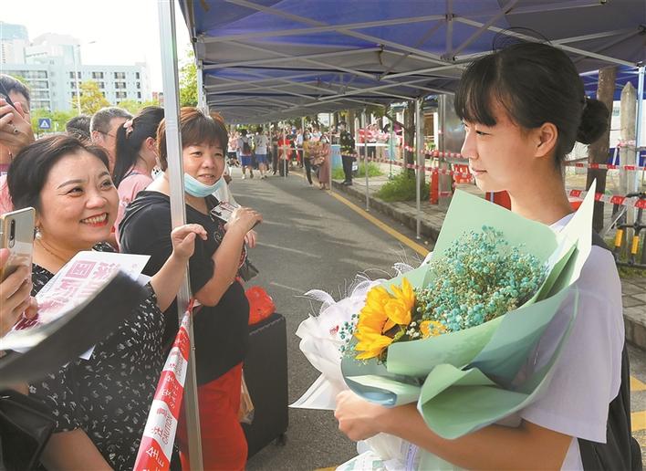 家長(zhǎng)帶著鮮花來到寶安中學(xué)考場(chǎng)門口迎接考生。深圳商報(bào)記者陳錫明攝
