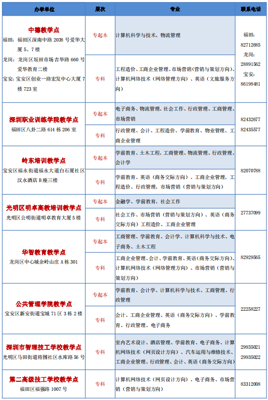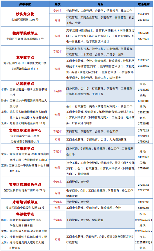 深圳開放大學(xué)2021年春季招生教學(xué)點與專業(yè)公示