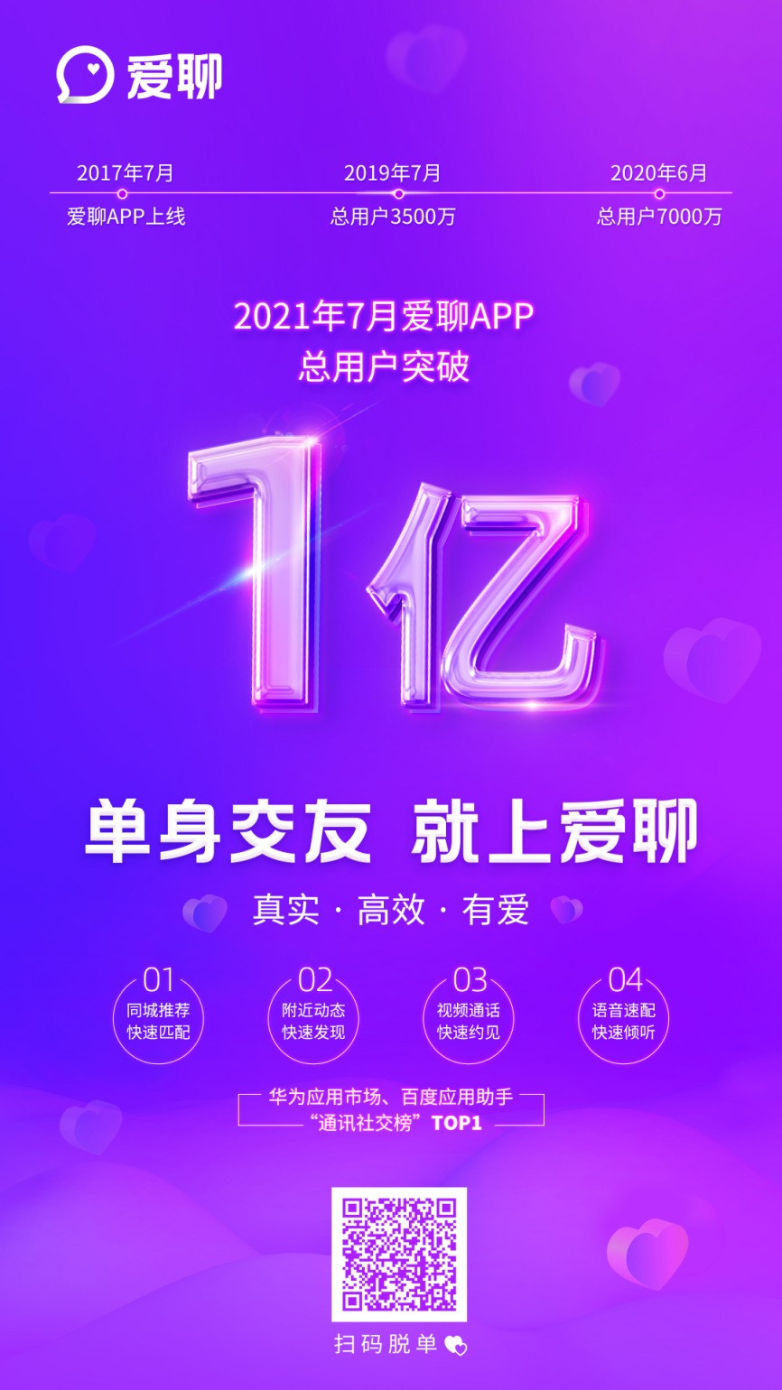 作為事件主人翁,愛聊近期頻頻發(fā)聲。從7月2日品牌升級,煥新品牌視覺形象,全新定位單身交友,到7月26日,對外宣布注冊用戶超1億,引起行業(yè)關注。今年,這匹社交黑馬以魚躍之姿,一舉打開知名度,吸睛無數,各平臺下載指數飆升。從“社交黑馬”到“單身交友破局者”,創(chuàng)新性主打真實和高效,贏得用戶信賴的背后,且看愛聊一億用戶的增長戰(zhàn)略。