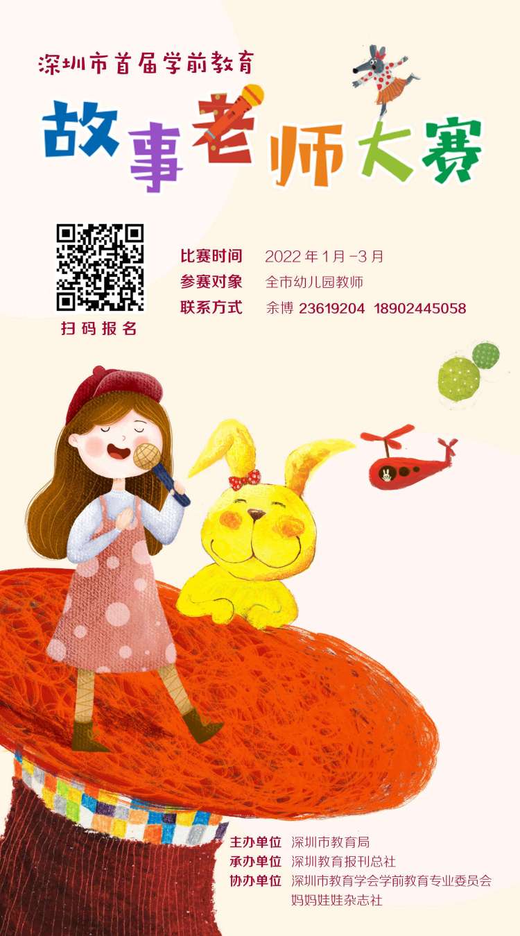 讀特客戶端·深圳新聞網2022年1月12日訊 (記者 陳彬 通訊員 程玉珂)由深圳市教育局主辦,深圳教育報刊總社承辦,深圳市教育學會學前教育專業(yè)委員會、媽媽娃娃雜志社協(xié)辦的深圳市首屆學前教育“故事老師”大賽暨原創(chuàng)繪本大賽將于2022年1-3月舉辦。