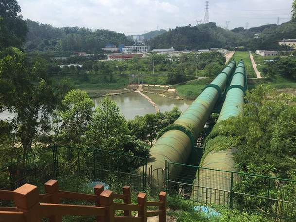 【直播君】:經(jīng)過一路跋涉,直播小分隊已經(jīng)到達今天的第一站坑梓水庫啦,先看看地面這一條條引水管道,水庫全貌航拍圖馬上新鮮出爐!
