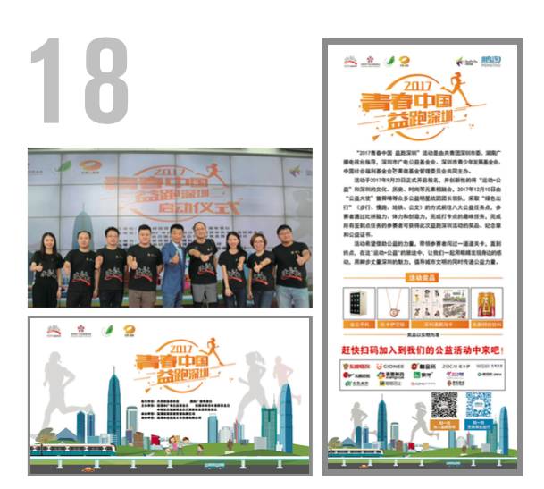 由深圳市廣電公益基金會(huì)、深圳市青少年發(fā)展基金會(huì)等主辦,深圳棠果影視傳媒有限公司承辦。“2017青春中國益跑深圳”活動(dòng)作為創(chuàng)意公益募捐慈善活動(dòng),通過招募深圳市民自愿以“綠色出行”(步行、慢跑、地鐵、公交)的方式完成城市穿越,從而為10個(gè)社會(huì)慈善項(xiàng)目進(jìn)行募捐的大型公益活動(dòng)。