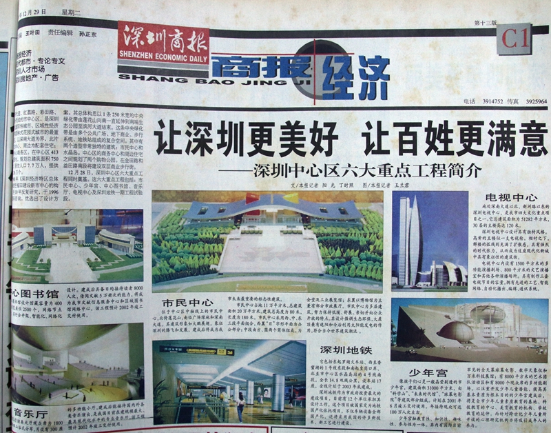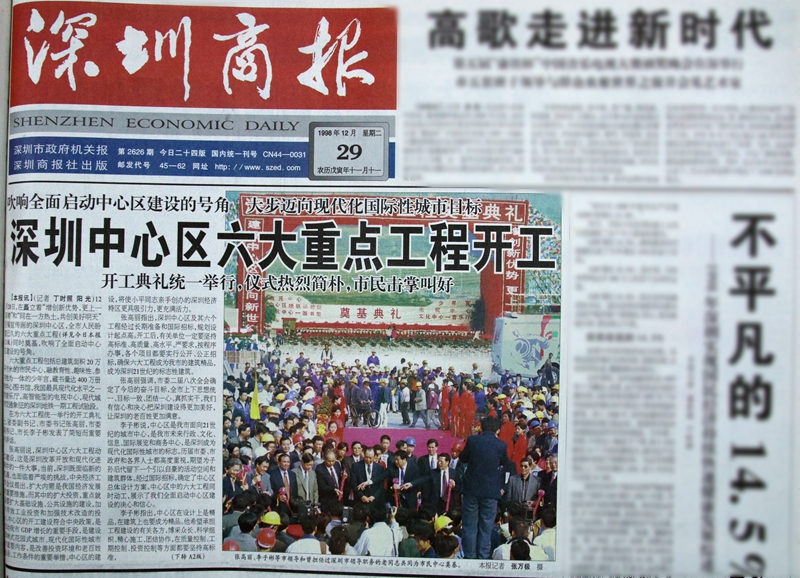 1998年12月29日,深圳商報頭版報道深圳中心區(qū)六大重點工程開工