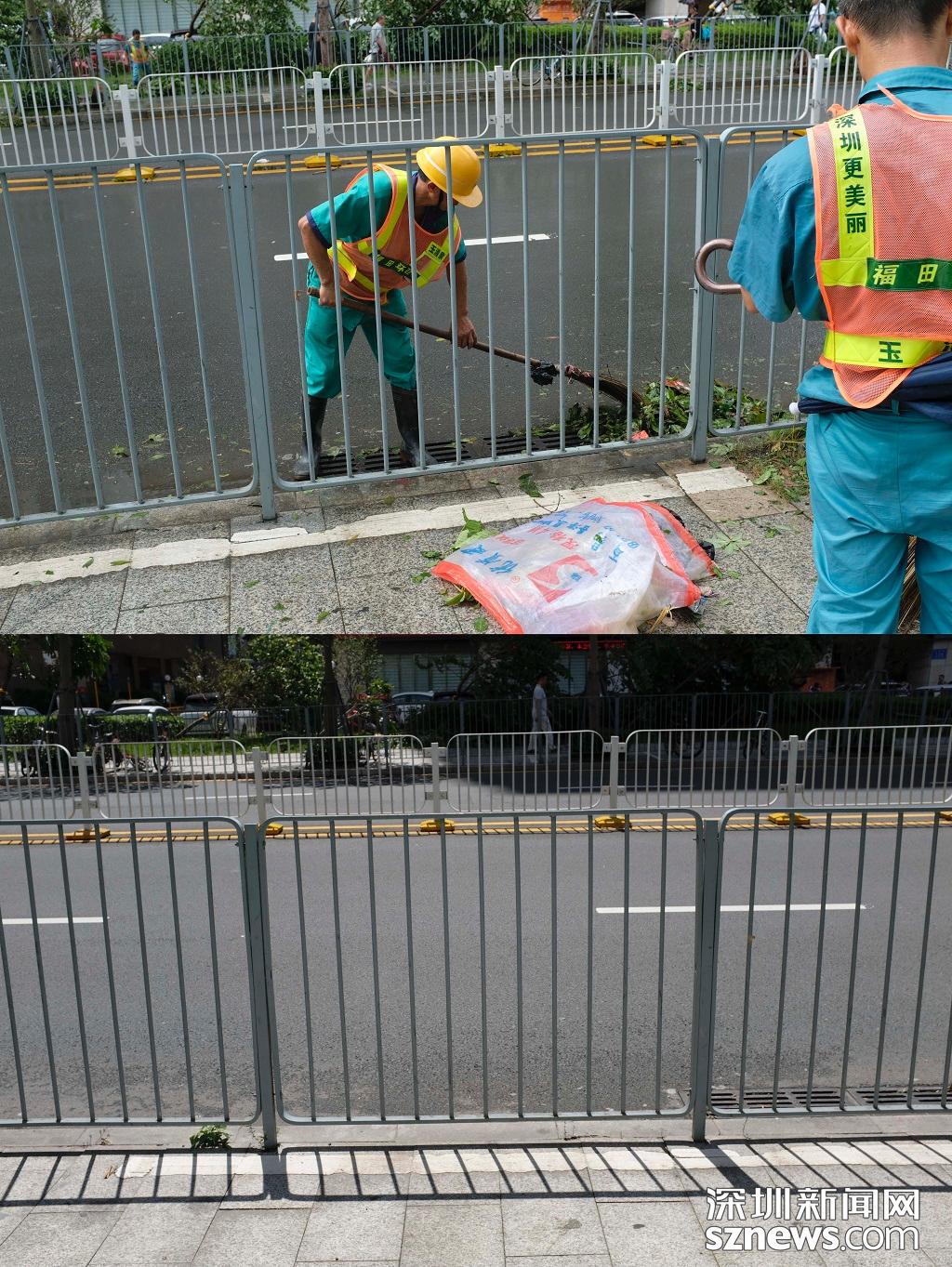 蓮花西地鐵站A出口前后對比圖(上圖:2018年9月17日,臺風(fēng)過后,路面一片狼藉,環(huán)衛(wèi)工人正在清掃。下圖 2018年9月18日下午五點,路面清掃完畢,恢復(fù)整潔)