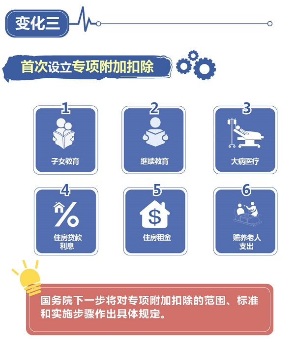 此次個稅改革還首次設(shè)立專項(xiàng)附加扣除,這是改革的突出亮點(diǎn),圍繞與群眾生活密切相關(guān)的支出領(lǐng)域,在現(xiàn)行稅法基本養(yǎng)老、醫(yī)療、失業(yè)保險金和住房公積金稅前扣除的基礎(chǔ)上,額外增加子女教育、繼續(xù)教育、大病醫(yī)療、住房貸款利息或住房租金、贍養(yǎng)老人等6項(xiàng)專項(xiàng)附加扣除,將進(jìn)一步增強(qiáng)稅制的公平合理性。根據(jù)稅法授權(quán),國務(wù)院下一步將對專項(xiàng)附加扣除的范圍、標(biāo)準(zhǔn)和實(shí)施步驟作出具體規(guī)定。