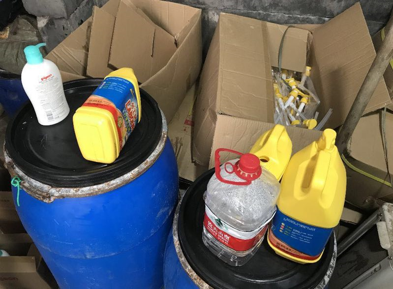 經(jīng)過執(zhí)法人員檢查,發(fā)現(xiàn)現(xiàn)場有疑似用來制作洗潔精、消毒液等的原料和工具,現(xiàn)場一些箱子中還有未灌裝的空罐子以及一些待貼標(biāo)簽。據(jù)了解,當(dāng)事人從外面以低廉價(jià)格買來比較劣質(zhì)、不知名的原料,通過簡單勾兌,再分裝成知名品牌日化用品。