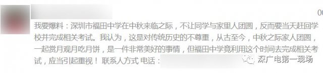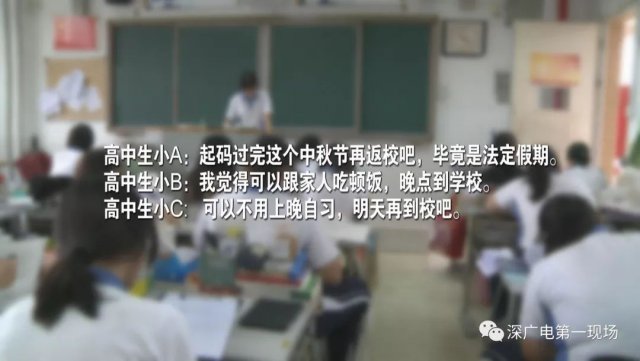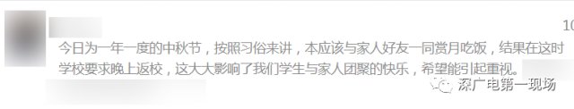 今天,深圳市高級(jí)中學(xué)、深圳市福田中學(xué)、沙井中學(xué)、東方英文書(shū)院的一些高中學(xué)生,通過(guò)在線留言等多種方式,向欄目反映,中秋節(jié)是法定假日,但他們卻沒(méi)法和家人一起吃飯團(tuán)聚,更別提賞月看晚會(huì)了,原因是學(xué)校要求寄宿的學(xué)生今天晚上要提早返校,參加晚自習(xí)或者考試。