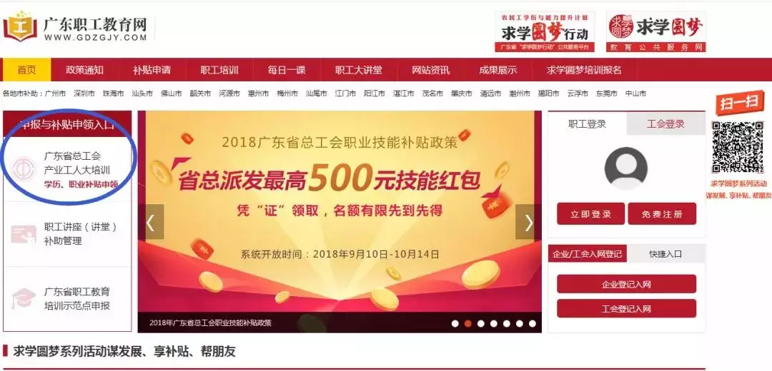 在網(wǎng)站(www.gdzgjy.com)首頁左側【申報與補貼申領入口】,點擊“廣東省總工會產業(yè)工人大培訓學歷、職業(yè)補貼申領”界面,選擇右側“職業(yè)技能提升補助”點擊【進入申領】。